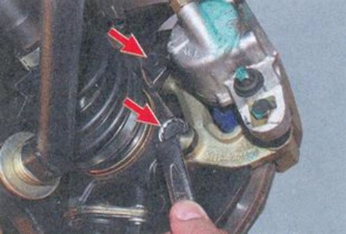 Необходимо открутить гайки с обеих сторон тормозного суппорта.