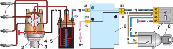 Система зажигания состоит из следующих элементов: 1 — свечи зажигания; 2 — распределитель зажигания; 3 — конденсатор; 4 — кулачок прерывателя; 5 — катушка зажигания; 6 — монтажный блок; 7 — реле зажигания; 8 — выключатель зажигания; А — к клемме «30» генератора