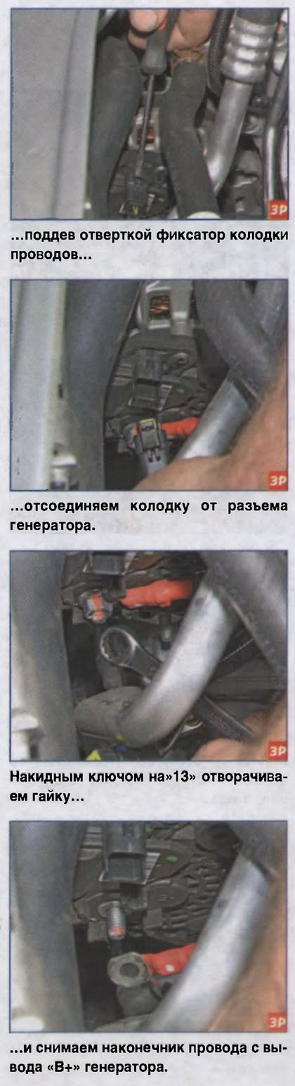Отсоединяем колодку провода возбуждения от разъема генератора, нажав отверткой на фиксатор. Затем ключом на 13 откручиваем гайку крепления плюсового вывода В2 на генератора и снимаем провод.