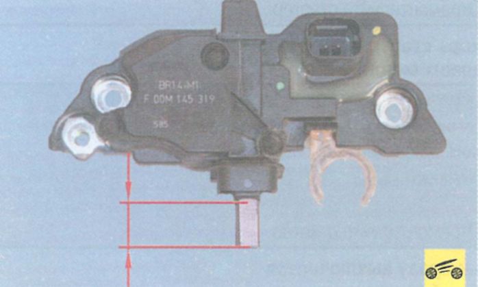7. Проверьте легкость перемещения щеток в щеткодержателе и их выступание. Если щетки выступают из щеткодержателя менее чем на 5 мм, замените регулятор напряжения в сборе со щеткодержателем.