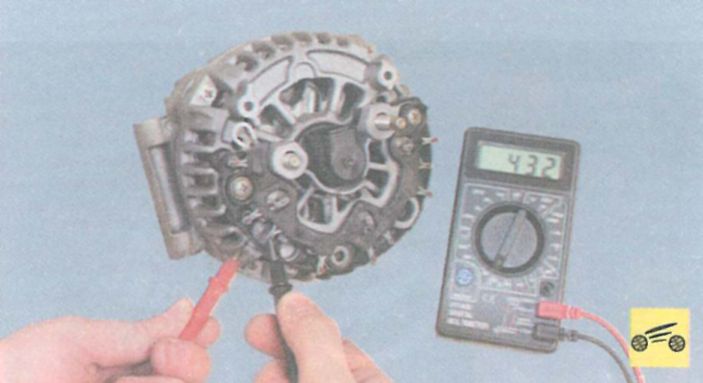 9. Проверьте диоды выпрямительного блока. Подсоедините один провод к «массе» выпрямительного блока, второй – к выводу диода.