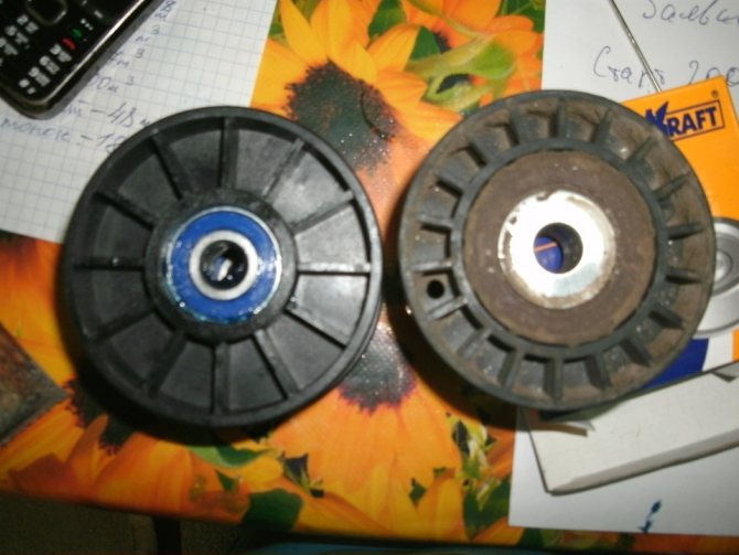 Дальше без проблем откручиваем 2 обводных ролика и 1 натяжной. Всё на фото для сравнения. Старые ролики не ясно что за фирма, да и не важно. Почистил, протёр и положил про запас. Был немного люфт, но не критично.