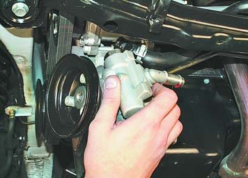 - Затем выкручиваем второй болт и снимаем насос ГУР полностью в сборе.