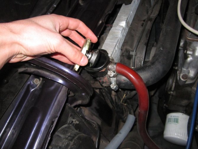 9) Затем переберитесь к радиатору, и отверните у него пробку сливного отверстия.