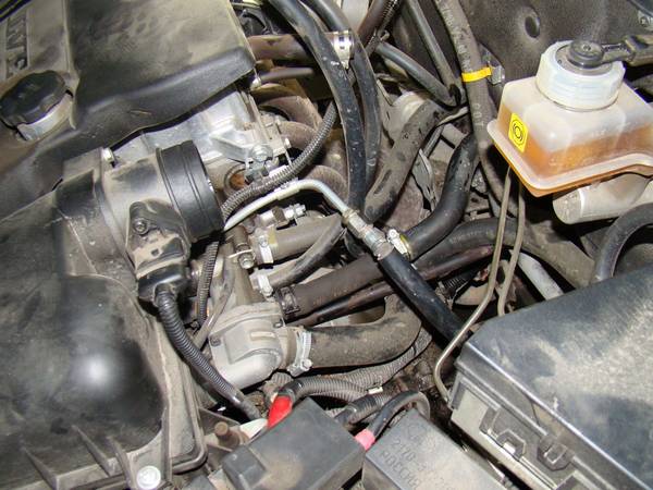 В варианте с электронной педалью газа, система охлаждения закольцовывается шлангом, который ранее шел на подогрев дроссельного узла. При помощи дополнительного шланга, тройника и хомутов, монтируется соединение меньшего диаметра для развоздушивания системы. Воздухоотвод устанавливается как можно ближе к термостату при помощи тройника, врезанного в шланг подвода к радиатору.