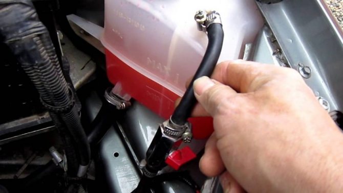 - Следите за продвижением тосола. Как только охлаждающая жидкость появится на горизонте, быстро верните шланг на прежнее место и плотно затяните при помощи хомута.