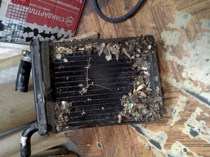 Такой засор чаще всего случается из-за отсутствия салонного фильтра или вследствие его долгого использования без замены. Устраняется такая неисправность путем снятия и промывки радиатора.