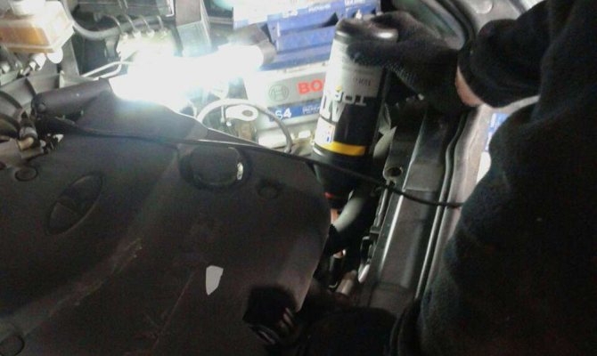 - Перед установкой нового фильтра в него необходимо залить масло (примерно на половину) и смазать им прокладку. Это делается для предотвращения «голодания», то есть двигатель не будет работать в сухую. Ставим новый компонент и закручиваем его;