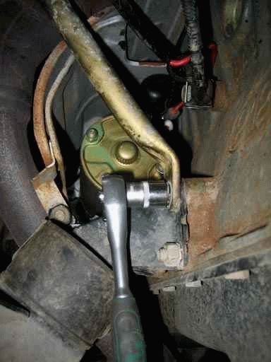 Но чтобы его вытащить оттуда, мешала защита стартера от тепла. Это такие листы металла вокруг него. Со стороны коробки стартер упирался в защиту своими выступами, в которые вкручиваются болты. В этом месте я просто отогнул защиту руками С другой стороны защита внизу крепится гайкой. Я попытался ее открутить большой трещеткой. Она не поддавалась. Тогда я чуть посильнее надавил и она вроде как провернулась. А когда я посмотрел, то увидел, что гайка и не думала отворачиваться, а просто я свернул ушко, к которому она крепилась. Правда при этом защита отогнулась и позволяла вынуть стартер и само крепление не отломалось совсем и вроде крепко держится и не дребезжит. Я все это потом так и оставил.