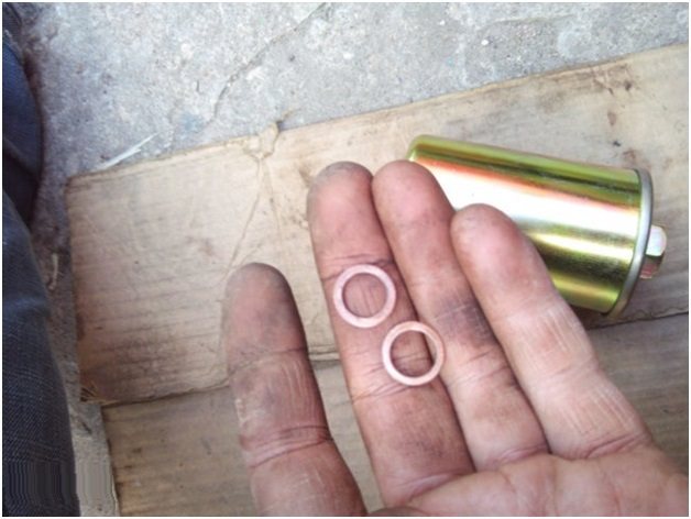 - Ставим на место изношенного новый фильтрующий элемент. Не забудьте поставить уплотнительные колечки в прижимные гайки. Кстати, если старые колечки имеют следы механического износа (порывы, порезы и пр.), то колечки обязательно и непременно нужно заменить на новые. Без уплотнительных колечек бензин будет прокапывать в местах подсоединения трубок к фильтру.