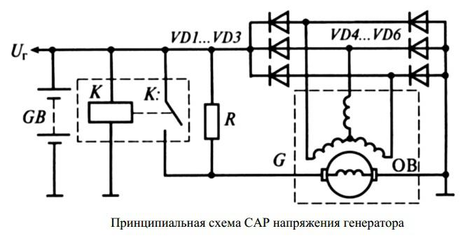 При работе генератора на выходе появляется напряжение, которое поступает на обмотку электромагнитного реле. При этом возникает магнитное поле, с его помощью притягивается плечо рычага. На последний действует пружина, она используется как сравнивающее устройство. Если напряжение становится выше, чем положено, контакты электромагнитного реле размыкаются. При этом в цепь включается постоянное сопротивление. На обмотку возбуждения подается меньший ток. По подобному принципу работает реле-регулятор напряжения генератора ВАЗ 21099 и других автомобилей отечественного и импортного производства. Если же на выходе уменьшается напряжение, то производится замыкание контактов, при этом изменяется сила тока в большую сторону.
