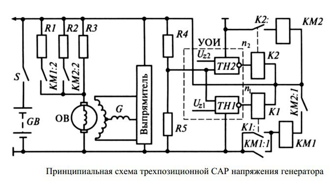 Здесь происходит сравнение действительного значения с минимальным и максимальным. Если напряжение отклоняется от того значения, которое задано, то появляется определенный сигнал. Называется он сигналом рассогласования. С его помощью производится регулирование силы тока, поступающего на обмотку возбуждения. Отличие от двухуровневой системы в том, что имеется несколько добавочных сопротивлений.