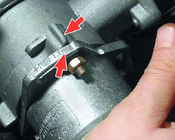 Для уменьшения угла опережения зажигания поверните корпус датчика против часовой стрелки (метку «-» на фланце корпуса датчика — к выступу на корпусе привода вспомогательных агрегатов). Затяните гайки крепления датчика, проверьте и при необходимости повторите установку момента зажигания. Подсоедините шланг к вакуумному регулятору.