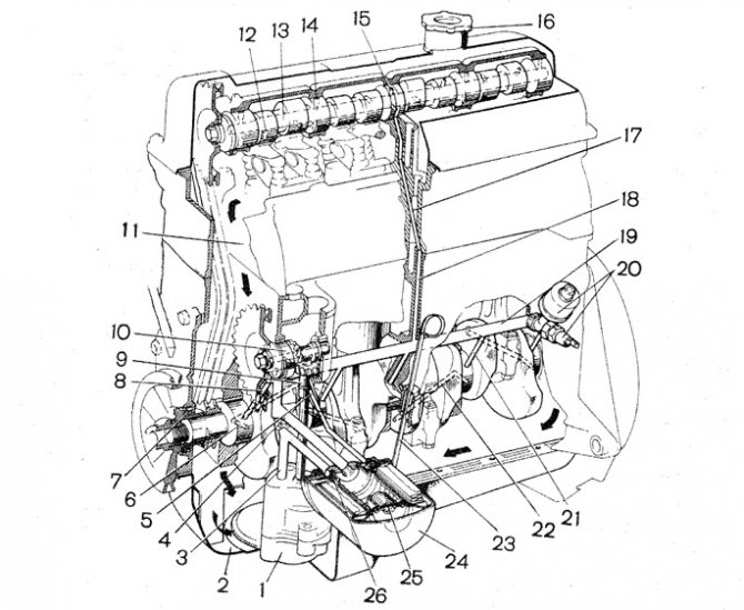 Рис. Схема системы смазки двигателя ВАЗ: 1 — масляный насос; 2 — масляный картер: 3 — канал подачи масла от насоса к фильтру; 4 — горизонтальный канал для подачи масла от фильтра в масляную магистраль; 5 — канал для подачи масла к шестерне привода масляного насоса и распределителя зажигания; 6 — канал в шейке коленчатого вала; 7 — передний сальник коленчатого вала; 8 — канал подачи масла от масляной магистрали к коренному подшипнику и к валику привода масляного насоса и распределителя зажигания; 9 — шестерня привода масляного насоса и распределителя зажигания; 10 — валик привода масляного насоса и распределителя зажигания; 11 — канал для стока масла; 12 — канал в кулачке распределительного вала; 13 — магистральный канал в распределительном валу; 14 — канал в опорной шейке коленчатого вала; 15 — кольцевая выточка на средней опорной шейке распределительного вала; 16 — крышка маслоналивной горловины; 17 — наклонный канал с головке цилиндров; 18 — вертикальный канал в блоке цилиндров; 19 — масляная магистраль; 20 — датчики давления и контрольной лампы давление масла; 21 — канал подачи масла к коренному подшипнику; 22 — канал подачи масла от коренного подшипника к шатунному; 23 — указатель уровня масла; 24 — масляный фильтр; 25 — перепускной клапан масляного фильтра; 26 — противодренажный клапан