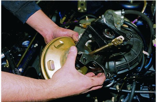 На следующем этапе можно переходить к демонтажу главного тормозного цилиндра. Важно не повредить его трубки. Снимается элемент вперед, без перекосов в сторону. Теперь можно открутить вакуумный усилитель. Как мы уже сказали, он находится на перегородке и установлен на кронштейнах. Последний закреплен на двух шпильках. Часто они ржавеют. Поэтому предварительно рекомендуется нанести сюда смазку либо раствор соды. После этого откручиваем гайки и вынимаем усилитель вместе с кронштейном. Далее откручиваем два «глухих» болта от вакуумника. Прикручиваем к кронштейну новый усилитель и устанавливаем его в обратном порядке.
