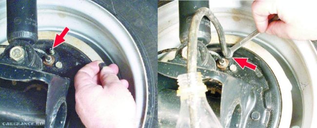 . На барабане заднего колеса находим штуцер (фото 1). Обычно он закрыт колпачком, который снимают. На штуцер одевают шланг.
