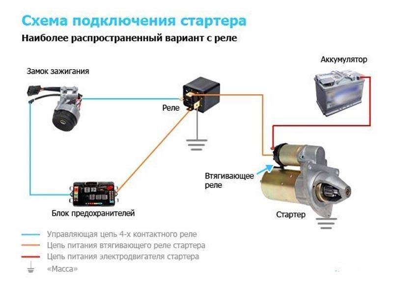 Итак, схема подключения стартера начинается от замка зажигания, в котором поворотом ключа замыкается электрическая цепь в реле запуска, соединенном с блоком предохранителей. Это реле дает команду втягивающему реле, а тот соединяет стартер с аккумулятором. От источника питания поступает электрический ток и механизм запускается.