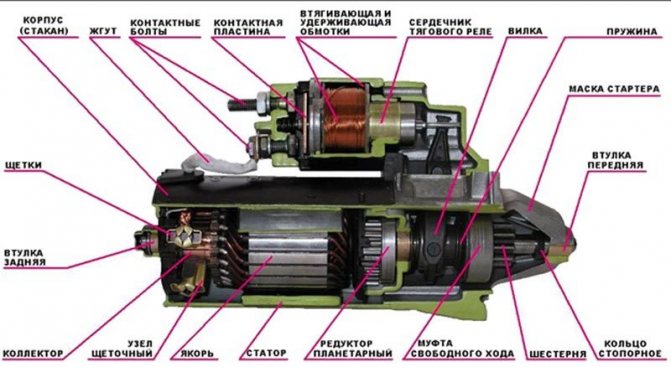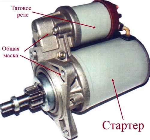 Стартер представляет собой двигатель, преобразующий электроэнергию, поступающую от аккумулятора в механическую энергию, которая служит начальным импульсом для движения поршней в ДВС.