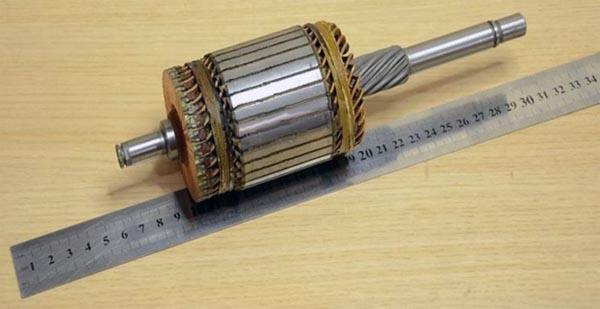 В пазы сердечника вставлены рамки, которые и будут вращаться под действием образуемого башмаками электромагнитного поля. Рамки своими концами соединяются с коллектором, к которому подведены 4 угольные щетки: