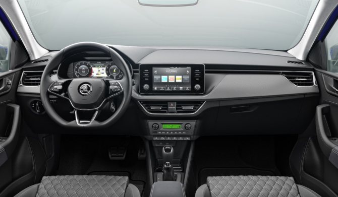 Новый Skoda Rapid практически ничем не отличается внутри от своего немецкого конкурента. Расположение элементов управления практически идентичное. Также на центральной консоли разместился большой экран информационно развлекательного комплекса, присутствует стильная приборная панель, где в центре также установлен небольшой экран для вывода основной информации, а также навигационной системы. Также здесь имеется привлекательный и минималистичный блок управления климатической системой. Автомобиль внутренне никак не отражает внешнее оформление, выполненное в агрессивном стиле. В салоне, напротив, все сделано в умеренном и практичном порядке.