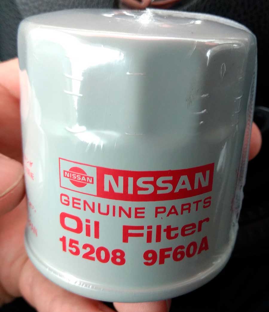 Оригинальный масляный фильтр, рекомендуемый для моторов Теана-2 – заводской артикул 15208-9F60A под брендом Nissan.