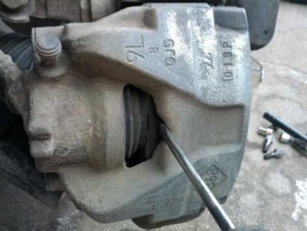 Подвижная часть суппорта удерживается болтом, для снятия крепления потребуются гаечные ключи для 6-гранных гаек размером 13 и 15 мм. Для упрощения процедуры ремонта необходимо вдавить поршень в цилиндр суппорта, манипуляция выполняется отверткой.