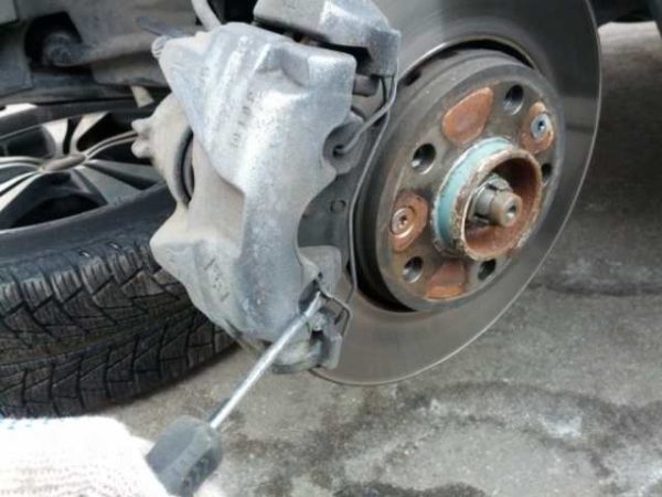 Последовательность действий стандартная для любого вмешательства в ходовую часть. Автомобиль поднимают, освобождается доступ к тормозному суппорту.