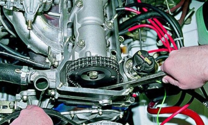 При вытянутой цепи пометки «уйдут». Основная сложность заключается в том, чтобы вернуть их в положение обоюдного совпадения. Эта работа совмещается с демонтажем старой цепки. Однако спешить ее снимать не стоит – рассогласование всех заводских маркеров чревато.
