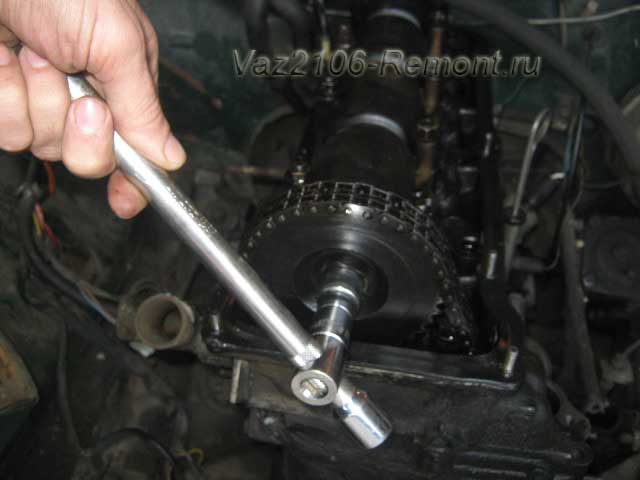 Далее можно приступать к отворачиванию всех гаек крепления корпуса (пенала) распределительного вала ВАЗ 2106. Сначала можно слегка ослабить их воротком, а потом быстро отвернуть трещоткой: